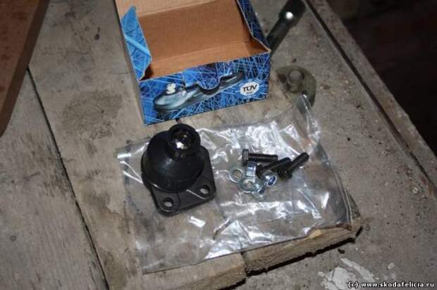 7.Устанавливаем новую шаровую, одной рукой потянув рычаг вниз, второй отводя колесо, а третьей... Чёт я куда-то погнал... Мы же договорились, что в одно лицо делаем... На самом деле было так: одной рукой тянули рычаг вниз, второй вставляли шаровую, при этом отводя постоянно мешающееся колесо. Но, т.к. масса стойки с колесом большая, отводится она очень легко... А на фотке - фотошоп ))8.Ставим болты, заводим шаровую в поворотный кулак и закручиваем гайки
