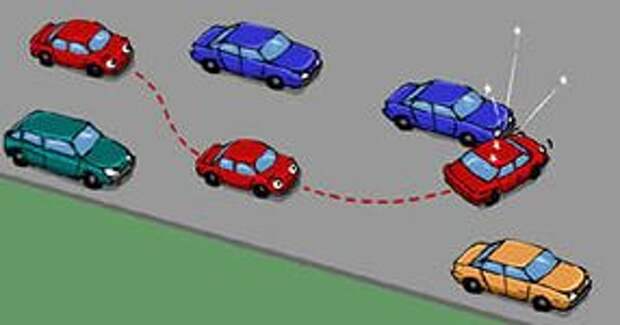 Схема 4. Провокатор ползет в крайнем левом ряду, как черепаха, вы его настигаете и при попытке обойти справа цепляете автомобиль-жертву Последствия те же, что и в схеме 1.