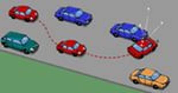 Схема 6. Вы подъезжаете к знаку «Уступите дорогу». Слева приближается машина, включившая указатель правого поворота. Понимая, что ваши пути не пересекаются, вы выезжаете на перекресток, а она, никуда не поворачивая, бьет вас в бок. После столкновения, как водится, включается «аварийка», а в ответ на ваше возмущенное «У тебя же был включен поворотник!» следует удивленно-невозмутимое «Какой поворотник??».